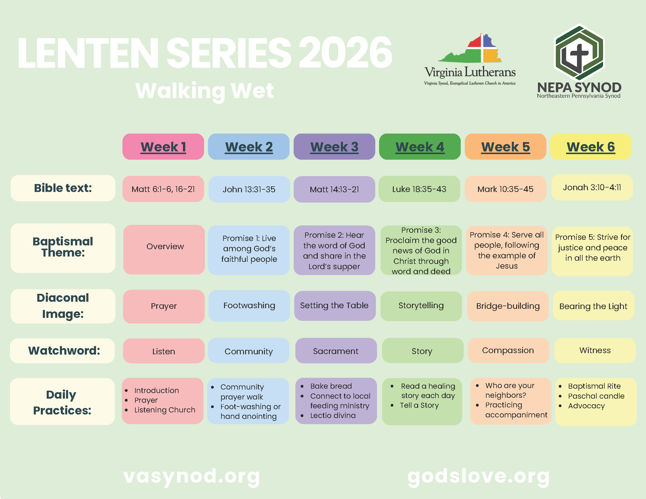Welcome to Walking Wet, a Lenten Series developed by the Northeastern Pennsylvania Synod and the Virginia Synod focused on the promises made at baptism. The five baptismal promises, which are made whenever someone is baptized, provide guidance as we live as a child of God in the world.  These promises are meant to drench us daily in God’s love and grace - promises for each day, not merely meant as a one-time deal at our baptism. You can see the promises in the baptismal service on page 228 in the Evangelical Lutheran Worship hymnal.