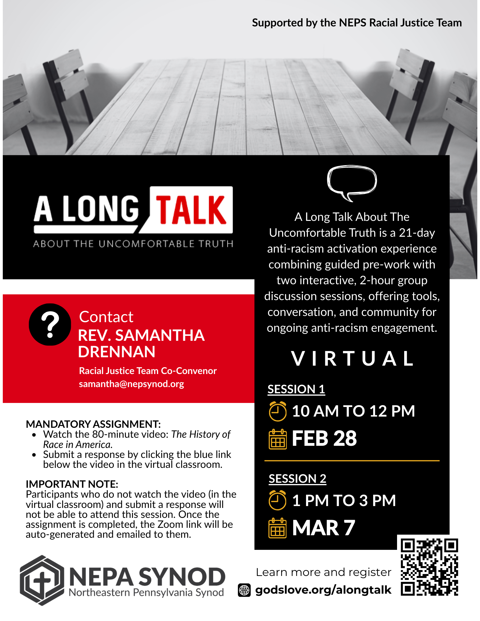 A Long Talk About The Uncomfortable Truth is a 21-day anti-racism activation experience designed to empower participants with knowledge and skills to combat racism in their daily lives. Our program features pre-work on racism's history and impact, followed by two, 2-hour group discussion sessions. The experience utilizes interactive large and small group conversations. We provide ongoing community support to foster continued growth and engagement in anti-racism efforts.