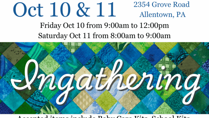 October 10 & 11 The Lutheran Center 2354 Grove Road Allentown Boxed quilt and kit donations will be collected at the Synod office on: Friday, October 10, from 9:00 AM to 12:00 PM Saturday, October 11, from 8:00 to 9:00 AM Accepted items include Baby Care Kits, School Kits, Personal Care Kits, and Quilts. The…