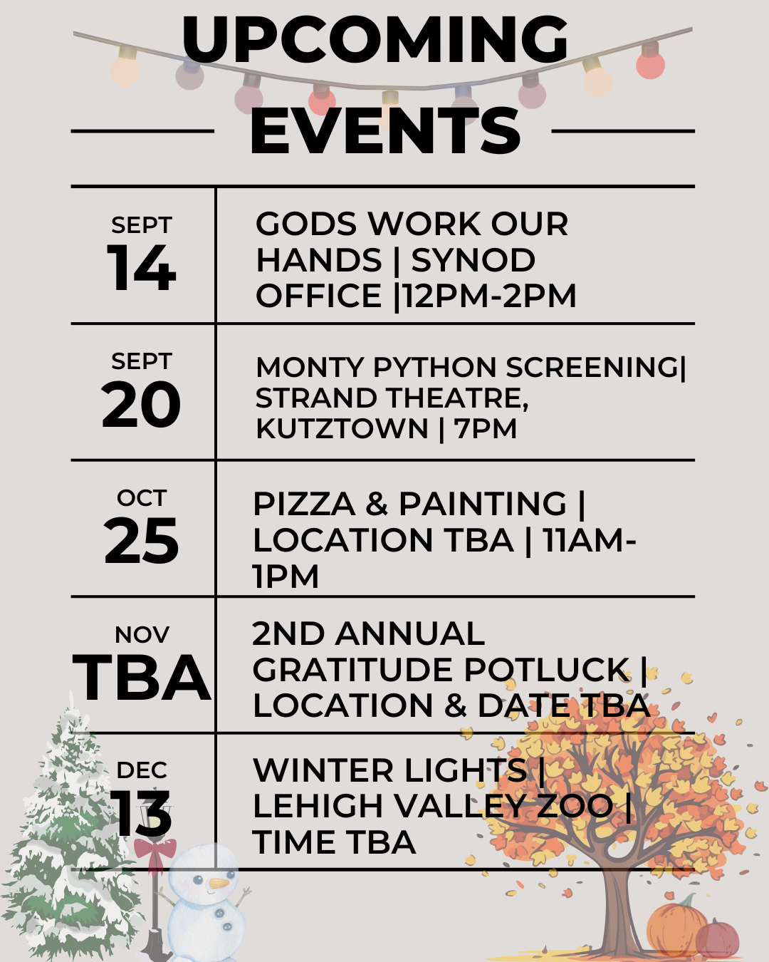 This ministry creates space for young adults to join in fellowship, worship, community, and conversation. Gather Lehigh Valley is a young adult (18-35) space created by, of, for, and with young adults. Gather Lehigh Valley is welcome to ALL young adults in the Lehigh Valley and the greater NEPA synod-across race, ability, faith background, gender, sexuality, and perspective to feel welcome to meet, to be, to gather. To connect, find us on social media @ Gather Lehigh Valley across platforms, or send an email.